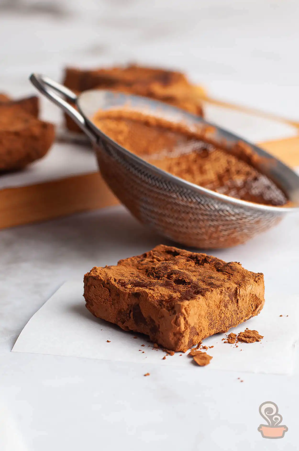 Geralmente o doce é servido em quadrados, e podem ser cobertos por uma camada de chocolate cremoso, ou como fizemos com chocolate em pó (no nosso caso, vamos utilizar o cacau 100%).