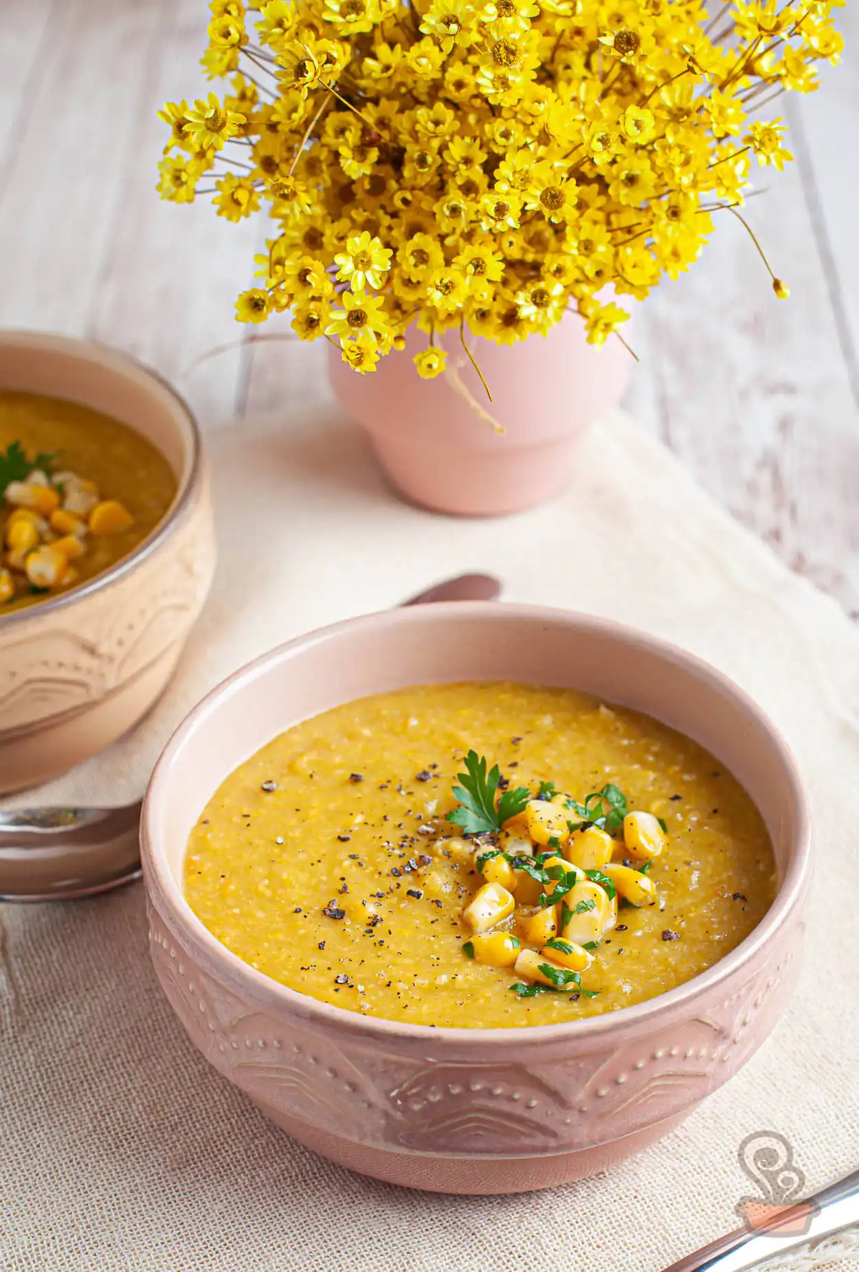 Sem dúvida nenhuma esse creme de milho com legumes é uma receita deliciosa para dias mais friozinhos. Além disso é super nutritiva e não tem nenhum ingrediente de origem animal.
